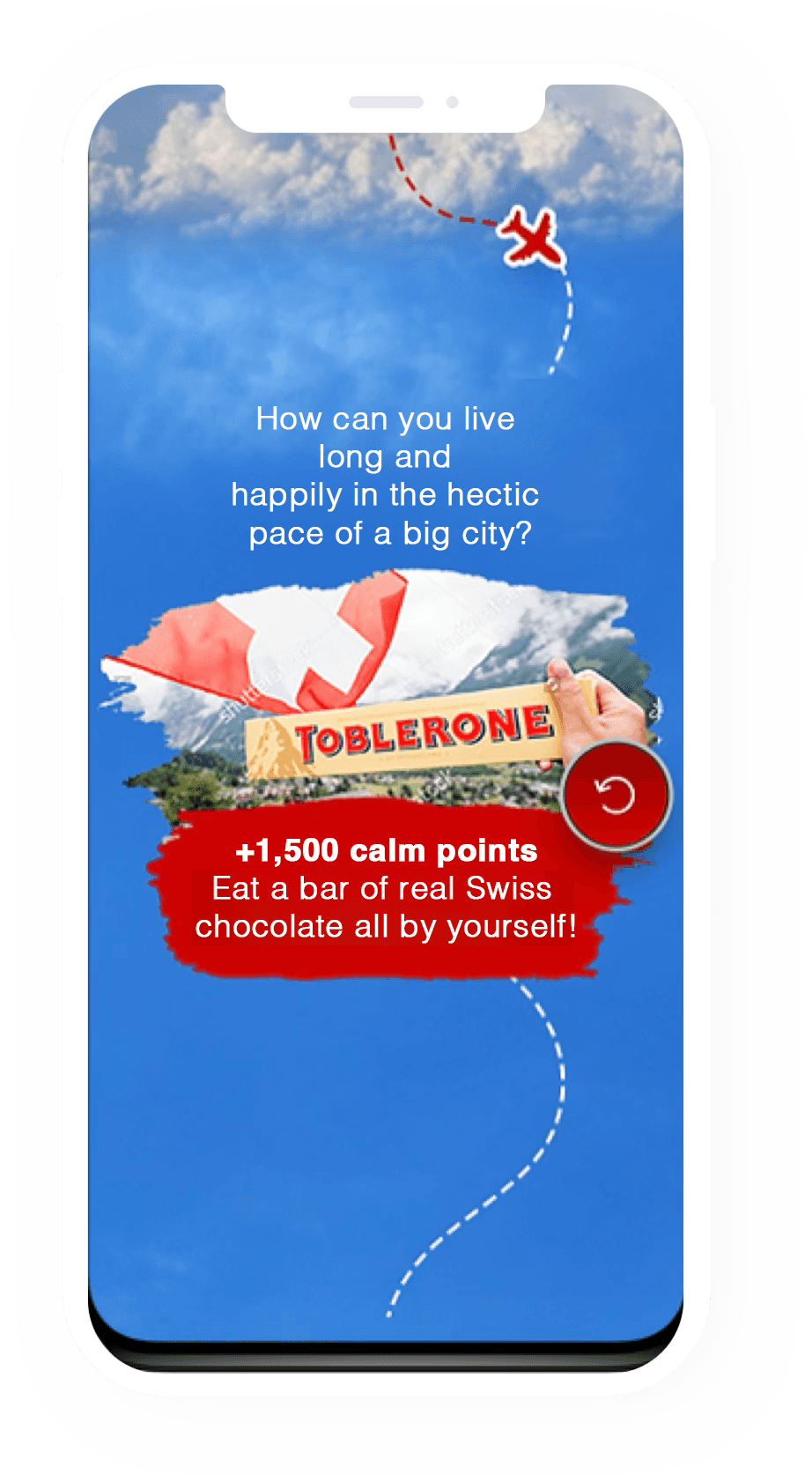 To promote a special offer from SWISS, we created a playful microsite featuring the “Swiss Calm” button. Users could press to measure their stress level, then instantly receive a personalised, Swiss-inspired recommendation—bringing a touch of Swiss serenity to their day.